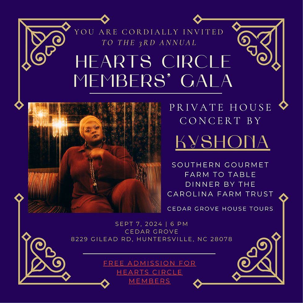 Presenting the 3rd Annual HEARTS Circle Members' Gala on September 7, 2024, from 6:00 to 9:00 PM. This event is free for all HEARTS Circle Members. We hope you can join us for an unforgettable evening at Cedar Grove. The event will feature a private house concert by the acclaimed singer/songwriter Kyshona. She is currently on tour for the release of her newest album, "Legacy," and her singing and storytelling were meant for HEARTS. Here are just a few reviews since her new album debut:
